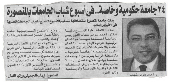 أعلن الدكتور احمد بيومي شهاب الدين رئيس جامعة المنصورة انه تقرر قيام
